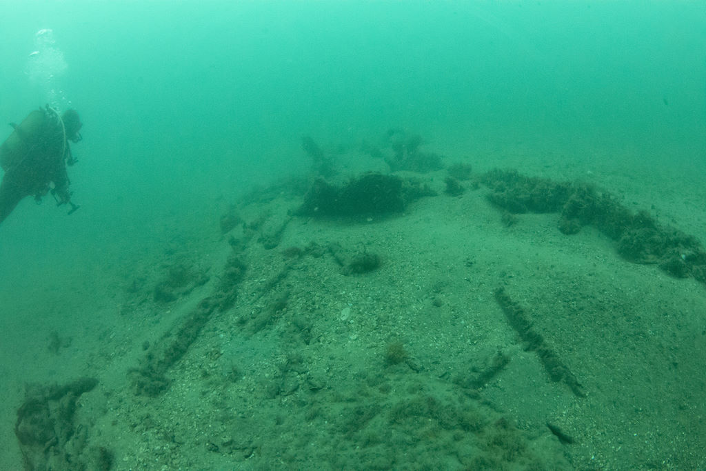 The wreck of the Iona II, lying upright on the seabed, with much of the hull hidden by sediment © Peta Knott, Iona II Dive Trail, 2015